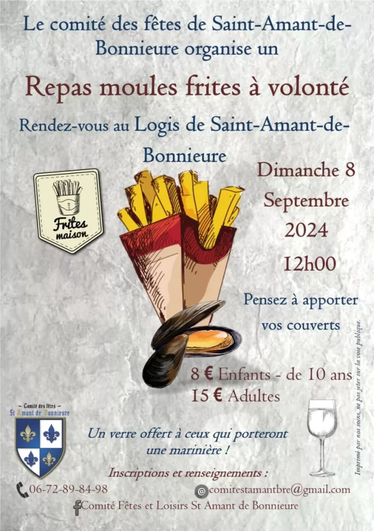 Repas moules frites à volonté, organisé par le comité des fêtes de Saint-Amant-de-Bonnieure.